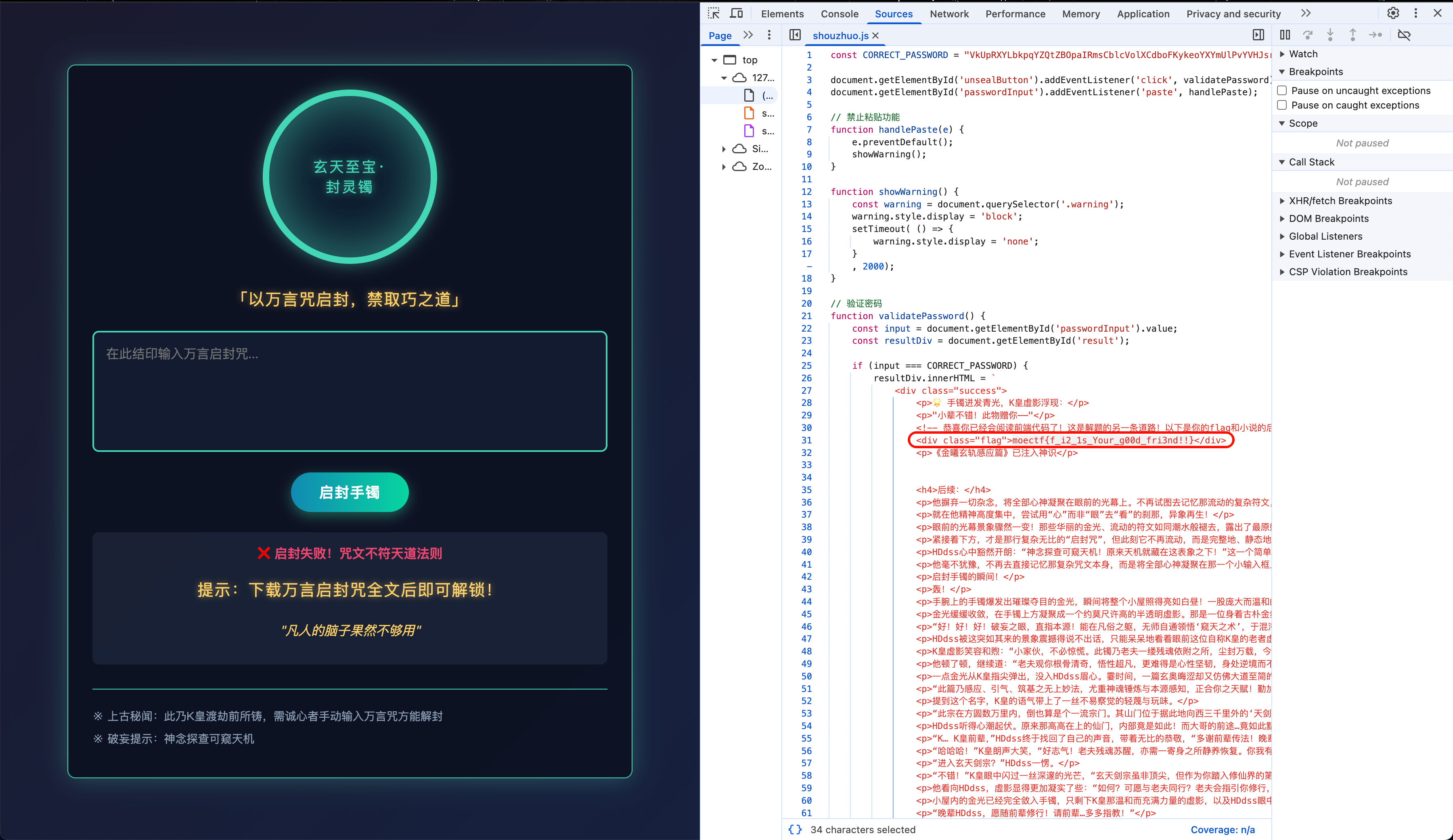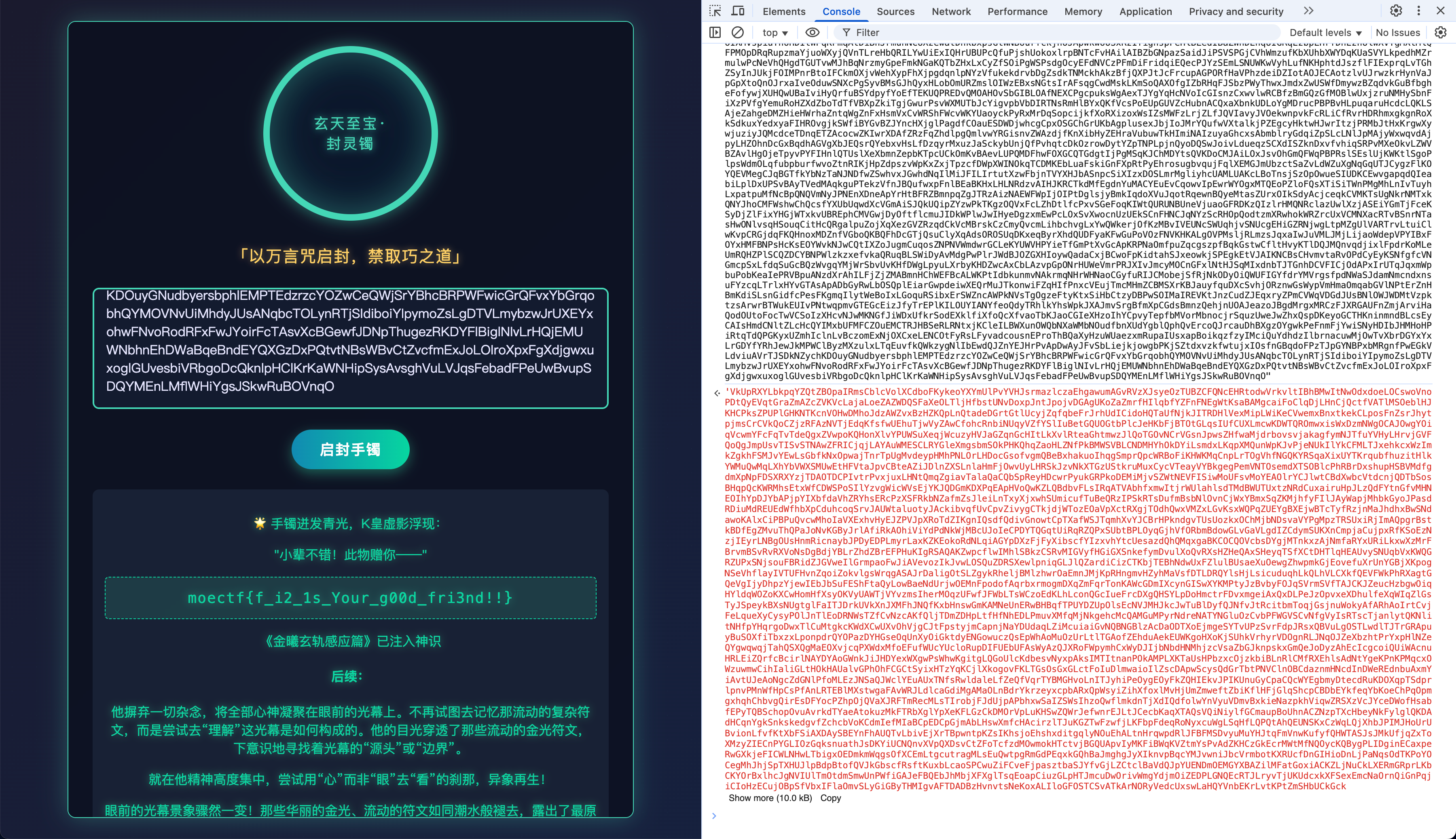 阅读前端 js 代码我们可以发现输入从 document.getElementById("passwordInput").value 获取,且控制台是允许我们复制粘贴的,因此我们在控制台输入 document.getElementById("passwordInput").value='password' 即可将文本输入进去,点击按钮即可得到 flag。