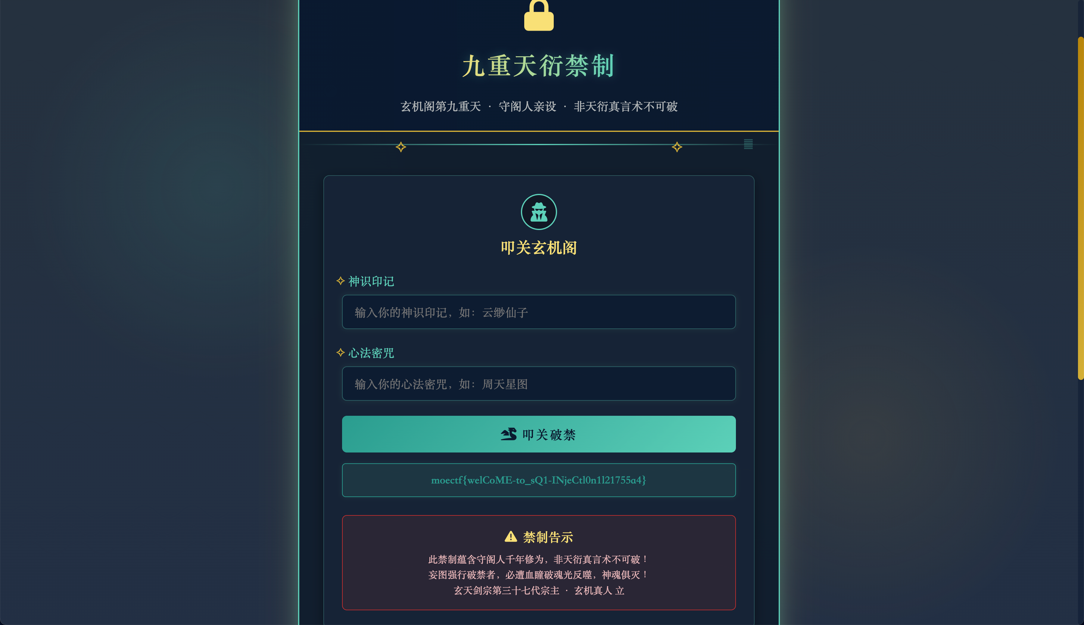 Web-6|第六章 藏经禁制?玄机初探!¶ 碎碎念¶ 一眼便知 SQL 注入 hhh WriteUp¶ 尝试进行注入用户名 admin' --(-- 表示注释),密码随便填即可完成注入: 得到最终 flag:moectf{welCoME-to_sQ1-INjeCtl0n1l21755a4} 💬 评论 评论系统加载中...
