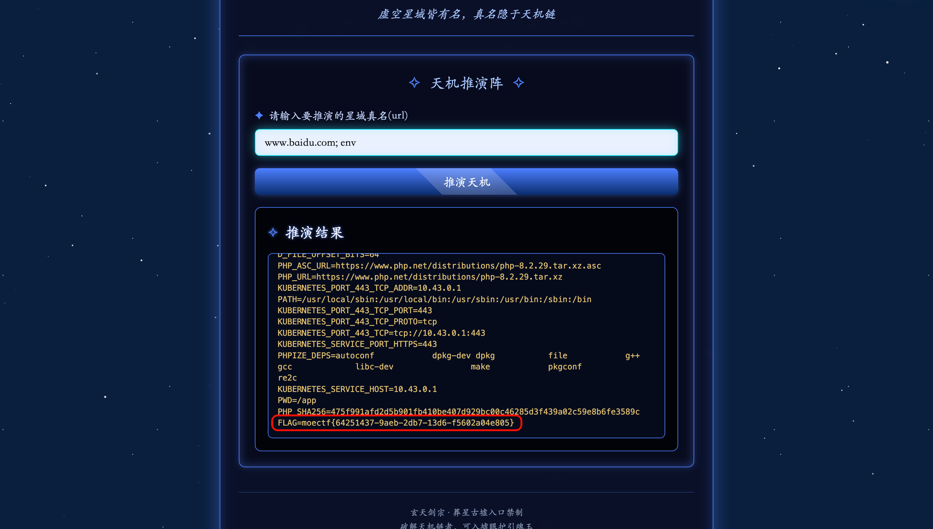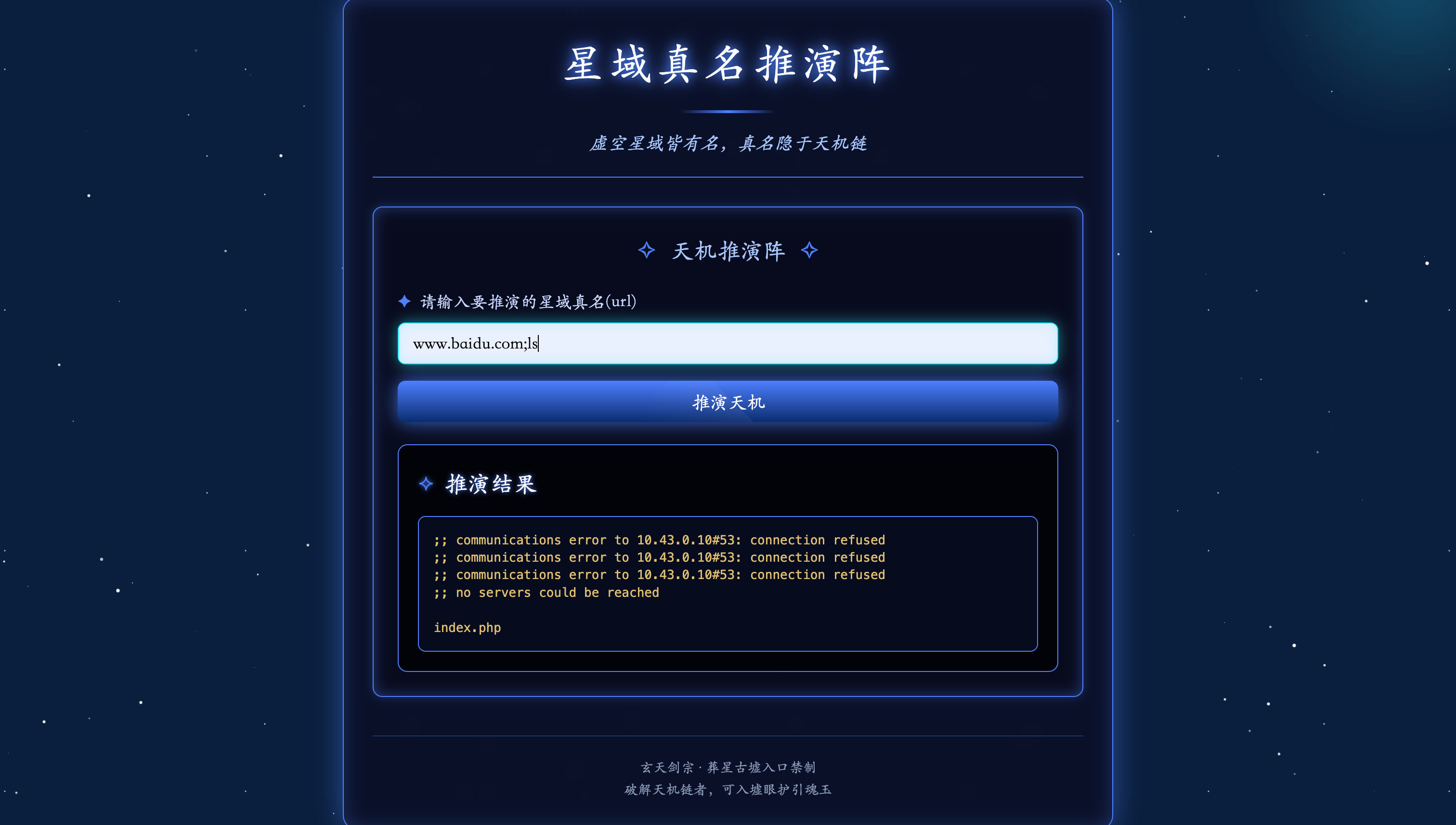 Web-9|第九章 星墟禁制·天机问路¶ 📖 阅读信息 阅读时间:1 分钟 | 中文字符:71 碎碎念¶ 前面多少 Bruce 还是知道点从这开始就进入未知领域了…… WriteUp¶ 随便输一个 www.baidu.com: 这似乎是一个 nslookup 或者 dig 该有的结果,尝试注入: 看到确实有回显,找了半天 flag 在 env 里面: 💬 评论 评论系统加载中...